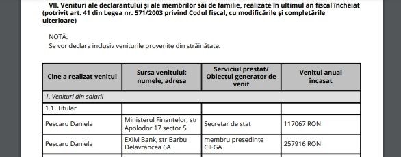 Daniela Pescaru primește două salarii de la stat: 117.067 lei anual de la Ministerul Finanțelor și 257.916 lei de la banca de stat EximBank. Astfel, femeia primește lunar peste 30 de mii de lei, dublu față de salariul președintelui Iohannis care este de 15 mii de lei net, potrivit Declarației de avere 2023.