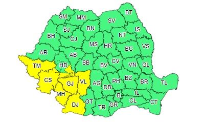 Pe lângă Gorj, sub Cod galben sunt și județele Mehedinți, Vâlcea, Dolj, Caraș-Severin, Timiș și Hunedoara.Administrația Națională de Meteorologie susține că se vor semnala averse, iar în intervale scurte de timp sau prin acumulare se vor înregistra cantităţi de apă ce vor depăşi 25 l/mp şi pe arii restrânse 40-60 l/mp.Instabilitatea atmosferică se va menține în Gorj până vineri dimineața. Vor fi ploi torențiale, descărcări electrice, intensificări ale vântului, vijelii şi căderi de grindină.