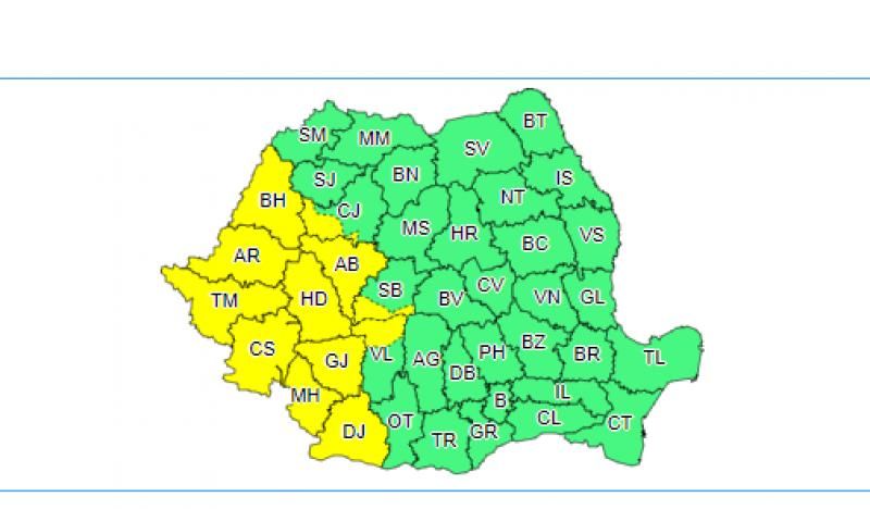 Meteorologii avertizează că duminică și luni sunt posibile căderi de grindină, averse torențiale, vijelii și descărcări electrice în județul Gorj, dar și în mare parte din Banat, Crișana, sud-vestul Transilvaniei și în Oltenia.