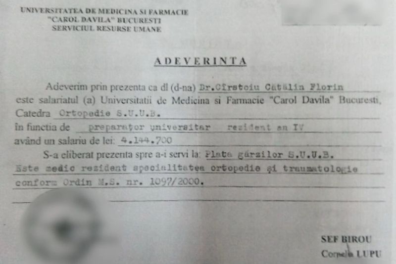 Un al doilea prezentat de Realitatea Plus arată faptul că medicul avea adeverință de medic specialist eliberată în ianuarie 2004, cu toate că a susținut examenul abia în iulie 2004.