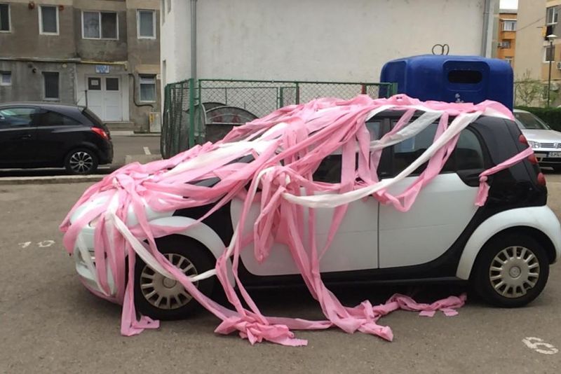 Fotografii cu mașini acoperite cu hârtie igienică roz parcate, mai mult sau mai puțin regulamentar la marginea străzilor din Târgu Jiu, apar tot mai mult pe rețelele de socializare.Prima mașină ”igienizată” din Târgu Jiu a apărut pe Facebook de 1 aprilie, iar mulți au crezut că este vorba despre o păcăleală.Nu se știe cine face acest lucru sau de ce, însă, este posibil ca acțiunea să fie făcută de cineva deranjat de felul în care gorjenii își parchează automobilele.