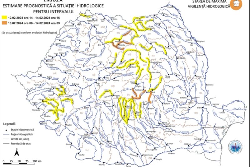 ”Acelaşi cod va fi activ în intervalul 12.02.2024 ora 18:00 – 14.02.2024 ora 16:00, pe anumite sectoare de râuri din bazinele hidrografice: Vişeu (judeţul Maramureş), Someşul Mare (judeţul Bistriţa Năsăud), Mureş (judeţele: Harghita, Mureş şi Bistriţa Năsăud), Târnava Mică (judeţele Harghita, Mureş şi Alba), Târnava Mare (judeţele: Harghita, Mureş, Braşov, Sibiu şi Alba), Bega (judeţul Timiş), Timiş, Bârzava (judeţele: Caraş Severin şi Timiş), Caraş (judeţul Caraş Severin), Olt (judeţele: Harghita, Covasna, Braşov, Sibiu şi Vâlcea), Argeş (judeţele: Argeş şi Dâmboviţa), Ialomiţa (judeţul Dâmboviţa), Suceava (judeţul Suceava), Moldova (judeţele: Suceava şi Neamţ) şi Bistriţa (judeţele: Suceava, Harghita, Neamţ şi Bacău)”, au transmis hidrologii.