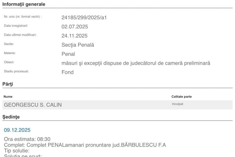Judecătoria Sectorului 1 a amânat, luni, pronunțarea în primul dosar penal în care candidatul interzis la alegerile prezidențiele, Călin Georgescu, a fost trimis în judecată de procurorii de la Parchetul General, pentru data de 9 decembrie.