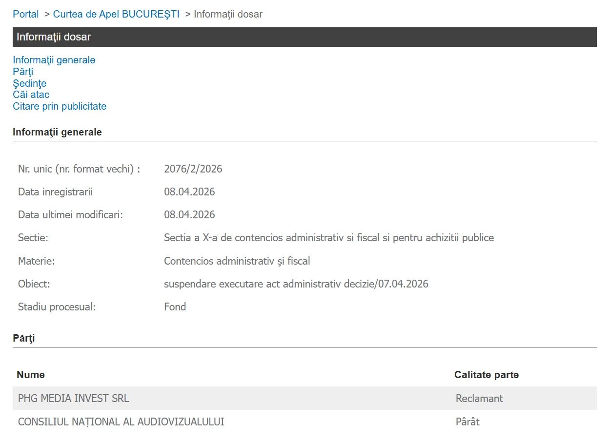 Decizia instanței este deja vizibilă în sistemul public al portalurilor de judecată, confirmând oficial că măsura CNA nu mai produce efecte, cel puțin temporar. Hotărârea este executorie, ceea ce înseamnă că produce efecte imediat.