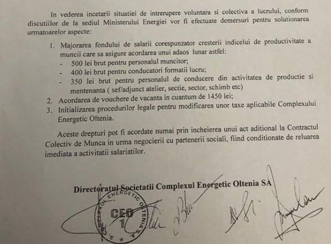 Astfel, conducerea CEO este dispusă să acorde majorări salariale de 500 de lei brut pentru personalul muncitor, 400 de lei brut pentru conducătorii de formații de lucru și 350 de lei brut pentru personalul de conducere din activitatea de producție și mentenanță, adică șefii și adjuncții atelier, secție, sector sau schimb.Cum anunțaseră și ieri, conducătorii companiei energetice, cea mai mare din Oltenia, va acorda angajaților și vouchere de vacanță în cuantum de 1.450 de lei. Acestea vor fi oferite începând cu 1 mai.CEO a ajuns la această soluție alături de cele 4 mari sindicate ale angajaților, după negocieri, însă aceste drepturi pot fi acordate doar dacă muncitorii încetează greva și își reiau activitatea.