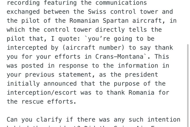 Președintele României a publicat recent o înregistrare care conține comunicările dintre turnul de control elvețian și pilotul aeronavei Spartan, în care turnul de control îi spune direct pilotului, citez: „veți fi interceptați de (numărul aeronavei) pentru a vă mulțumi pentru eforturile depuse la Crans-Montana”. Această înregistrare a fost publicată ca reacție la informațiile din declarația dumneavoastră anterioară, întrucât președintele anunțase inițial că scopul interceptării/escortării a fost acela de a mulțumi României pentru eforturile de salvare.