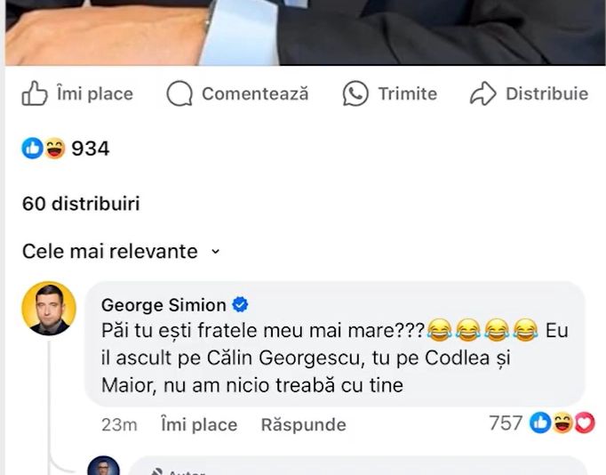 Toate mesajele au dispărut peste doar câteva minute. Într-o reacție pentru Realitatea PLUS, Victor Ponta a transmis că nu el le-ar fi șters, ci George Simion, și a susținut că le va face publice. Asta, deși inclusiv propriile sale comentarii dispăruseră de la postare.