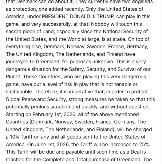 „Începând cu 1 februarie 2026, tuturor țărilor menționate mai sus (Danemarca, Norvegia, Suedia, Franța, Germania, Regatul Unit, Olanda și Finlanda) li se va percepe un tarif de 10% pentru toate bunurile trimise către Statele Unite ale Americii. La 1 iunie 2026, tariful va fi majorat la 25%. Acest tarif va fi scadent și plătibil până la încheierea unui acord pentru achiziționarea completă și totală a Groenlandei.”